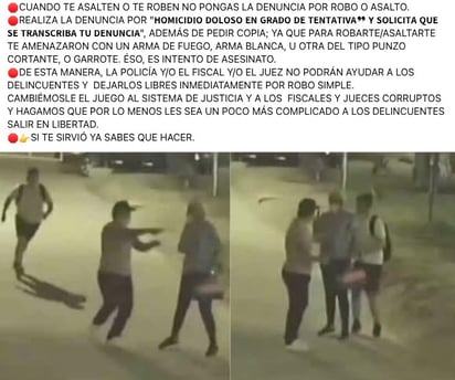 De acuerdo con las publicaciones, “si el ladrón te amenaza, te apunta con un arma o te agrede, ya no es robo, sino intento de homicidio”, y por ello recomiendan presentar la denuncia bajo ese término.