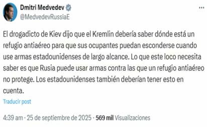 Dmitri Medvedev, vicepresidente del Consejo de Seguridad de la Federación Rusa y expresidente ruso, posteó en X que "el drogadicto de Kiev dijo que el Kremlin debería saber dónde hay un refugio antiaéreo para que sus ocupantes puedan esconderse cuando él utilice armas estadounidenses de largo alcance. Lo que ese loco necesita saber es que Rusia puede utilizar armas contra las que un refugio antiaéreo no protege. Los estadounidenses también deberían tener esto en cuenta".