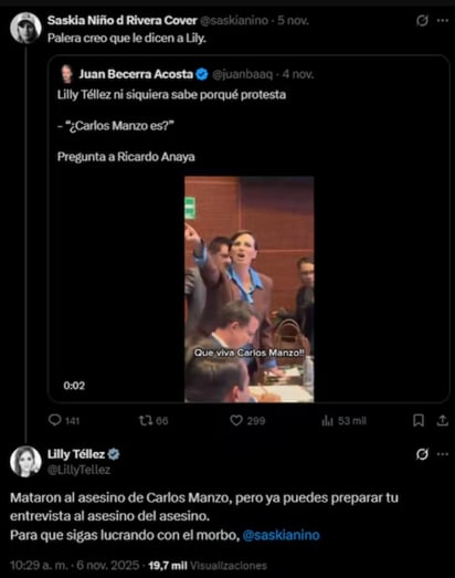 "Mataron al asesino de Carlos Manzo, pero ya puedes preparar tu entrevista al asesino del asesino. Para que sigas lucrando con el morbo", respondió Lilly Téllez y arrobó a Saskia.