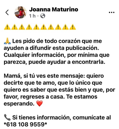 Se perdió la comunicación con ella el pasado 13 de agosto en los alrededores de Colonia Jalisco, del estado de Durango.