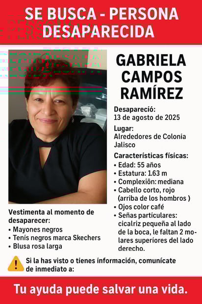 Como señas particulares, Gabriela Campos Ramírez mide 1.63 m, es de complexión mediana, pelo color rojo, ojos color café, y una cicatriz pequeña al lado de la boca, le faltan 2 molares superiores del lado derecho.