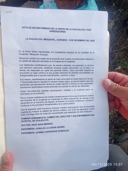 Un segundo día de plantón se cumplió en el Hospital Integral de La Guajolota, en el municipio de Mezquital, Durango, por parte de habitantes de la propia comunidad y de localidades cercanas, ante la deficiente atención médica que se ofrece en el lugar y que ha puesto en riesgo la vida de varias personas.