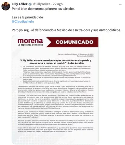 “Por el bien de Morena, eran primero los cárteles. Esa es la prioridad de la presidenta de México”, escribió.