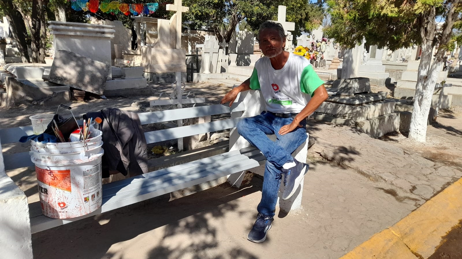Sergio Amador es pintor y rotulista, y desde hace 30 años acude al Panteón de Oriente, pero no para visitar alguna tumba, aunque comenta que tiene un tío sepultado ahí, sino para ganar un dinero extra ofreciendo sus servicios como pintor y rotulador.