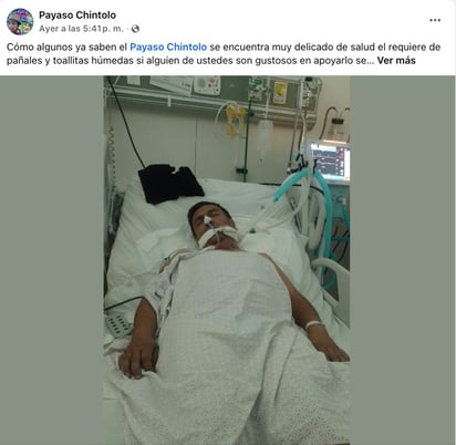 A través de redes sociales se ha solicitado el apoyo de la ciudadanía para el Payaso Chintolo, quien actualmente se encuentra en una situación de salud delicada y requiere de artículos como pañales y toallitas húmedas.