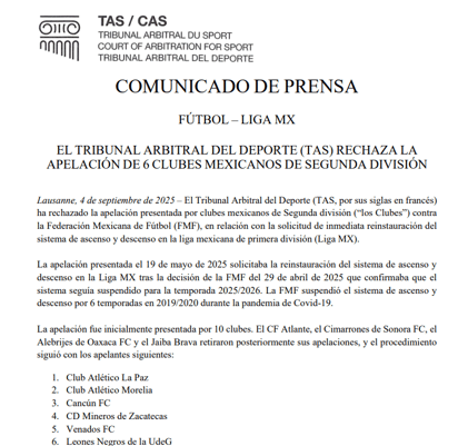 En un comunicado, el Tribunal Arbitral del Deporte (TAS) rechaza la apelación presentada, sin embargo, hace referencia a que los demandantes buscaban que se restaurara de manera inmediata, lo cual no podía ser posible.
