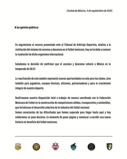 "Somos conscientes de las dificultades que hemos superado para llegar hasta aquí y hoy celebramos un paso decisivo. Es momento de pasar página y comenzar a escribir una nueva historia en beneficio del futbol mexicano", concluyen.