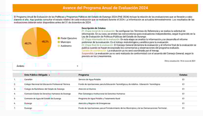 En tal sentido, se había programado la realización de 29 evaluaciones a programas de diversos entes públicos obligados, como parte del Programa Anual de Evaluación de las Políticas y Programas Públicos del Estado de Durango 2024 y se tenía el compromiso de informar de manera trimestral en torno a los avances, así como el informe final antes del 31 de diciembre de 2024. Sin embargo, la última actualización fue en marzo de ese año.