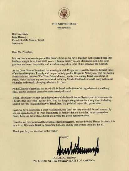 El presidente israelí, Isaac Herzog, afirmó este miércoles que recibió una carta de su homólogo estadounidense Donald Trump en la que le pide indultar al primer ministro Benjamin Netanyahu, quien está siendo juzgado por tres casos de corrupción.