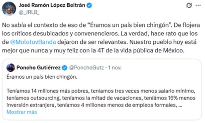 "No sabía el contexto de eso de "Éramos un país bien ching*n´, de flojera los críticos desubicados y convenencieros, la verdad, hace rato que los de Molotov dejaron de ser relevantes, nuestro pueblo hoy está mejor que nunca y muy feliz con la 4T, de la vida pública de México".