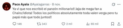 Tras la publicación de ese post, ninguno de los integrantes del grupo abordó el tema a través de sus redes, no sino hasta que, este sábado, 8 de noviembre, Paco recurrió a su cuenta de X para enviar un mensaje directo a López Beltrán, reiterando el repruebo que le inspiran los políticos en general.