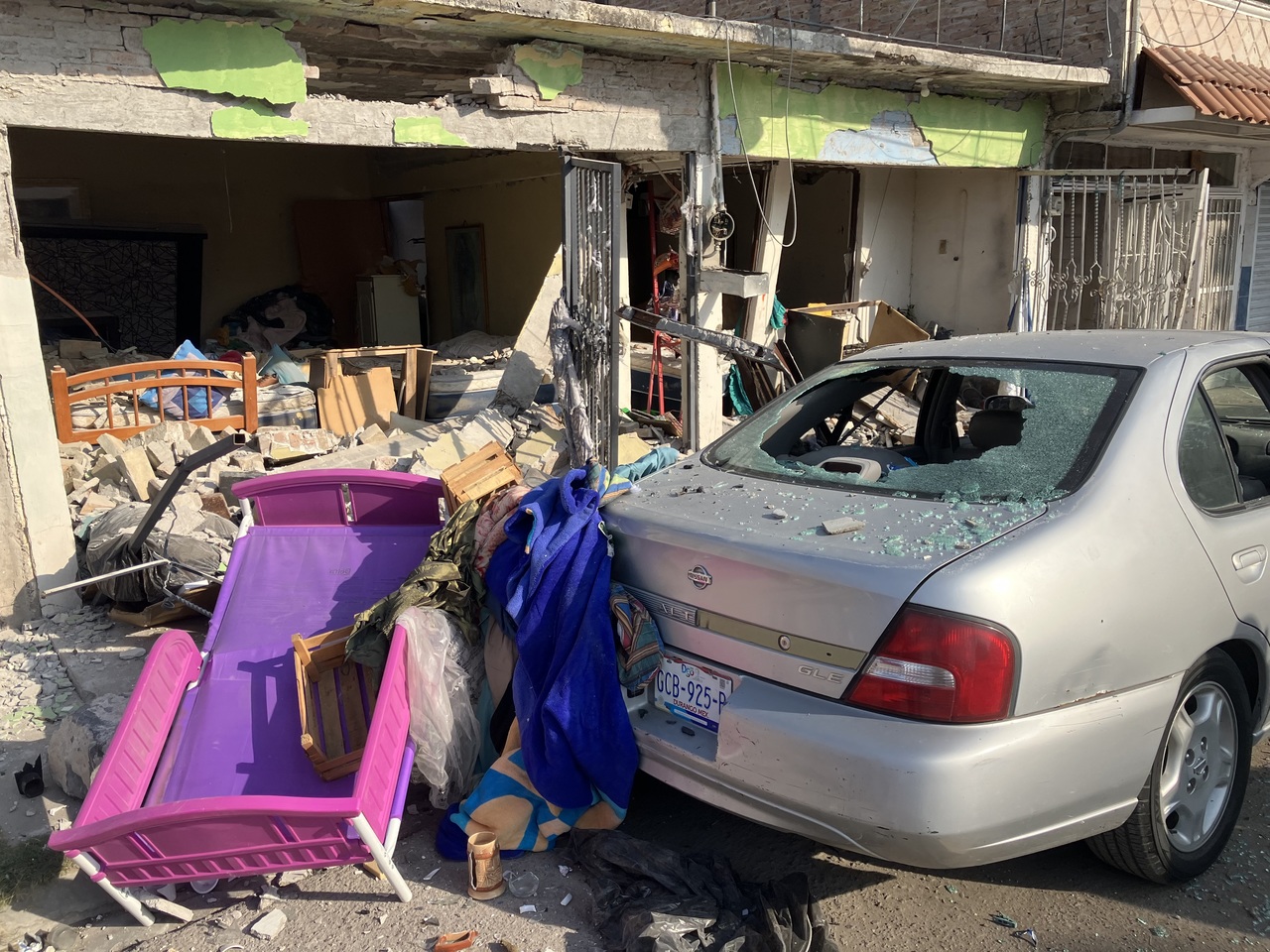 Un automóvil que se encontraba estacionado frente al domicilio afectado presentó daños, principalmente la ruptura de cristales, además de afectaciones en fachadas y estructuras cercanas, entre ellas una farmacia.