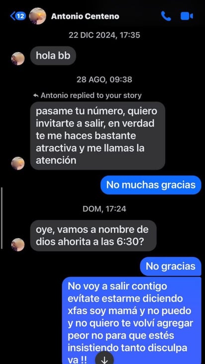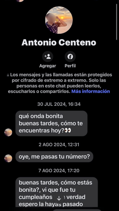 Fue una usuaria duranguense quien posteó capturas de pantalla de los mensajes que recibió de una cuenta de un presunto “Antonio Centeno”, quien desde el año pasado respondía a sus historias en Facebook con mensajes e invitaciones a salir.