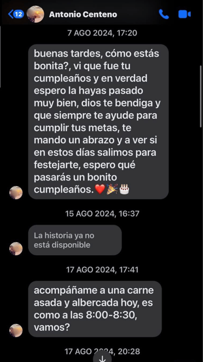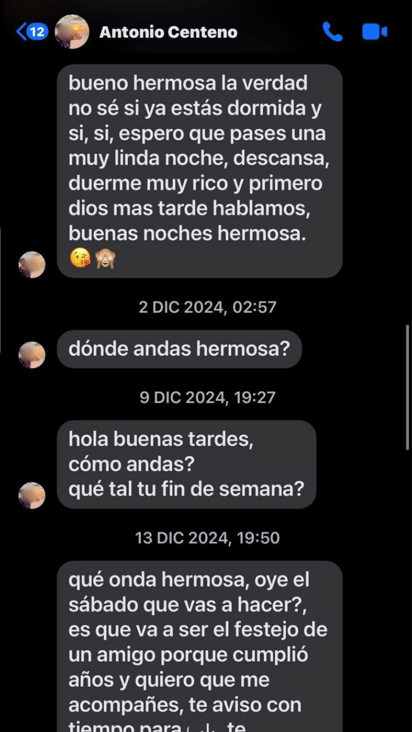 Las capturas de pantalla demuestran que a pesar de no haber recibido respuesta, el acosador seguía insistiendo en mensajes donde la invitaba a cenar, a una fiesta o a dar una vuelta. Así constantemente durante gran parte del 2024.