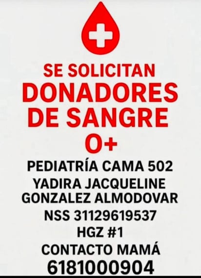 Si usted tiene la bondad de poder colaborar, por favor, acuda al IMSS, Clínica No.1, o también, puede comunicarse directamente con la madre de la menor al número 618 100 09 04.