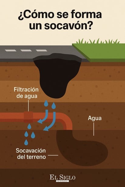 Un socavón no es un simple bache. Se origina cuando el agua —de lluvia, fugas de tuberías o drenaje deficiente— filtra lentamente el subsuelo, lavando las capas de soporte. Con el tiempo, esa erosión crea cavidades ocultas. Desde la superficie, la calle puede lucir estable, pero debajo el terreno pierde fuerza hasta que, con el peso de un vehículo o una nueva carga de agua, la cubierta colapsa de golpe.