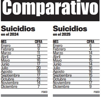 Aunque 2025 mostró una baja general, meses como noviembre destacaron con cifras altas, al registrar 17 suicidios, superando incluso algunos meses críticos de 2024.