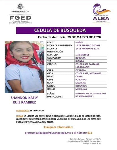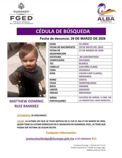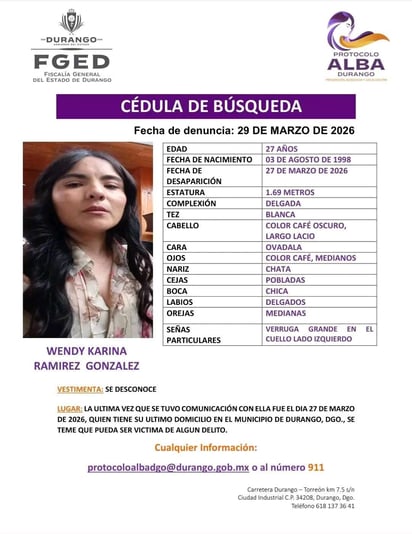 La Fiscalía General del Estado de Durango activó el Protocolo Alba ante la desaparición de tres personas en la capital, quienes tienen 27, 8 y 2 años de edad.