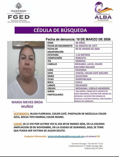 Se trata de María Nieves Broa Muñoz de 48 años de edad, quien fue vista por última vez el 9 de marzo de 2026 en la colonia Ampliación 20 de Noviembre.