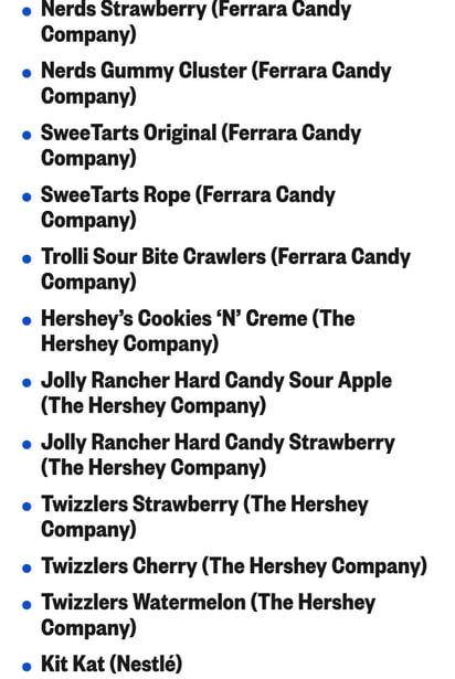 Mars, Mondelez Internacional, The Hershey Company, Nestlé, esto con base en lo difundido por Healthy Florida First, iniciativa que se creó para reforzar la transparencia alimentaria.