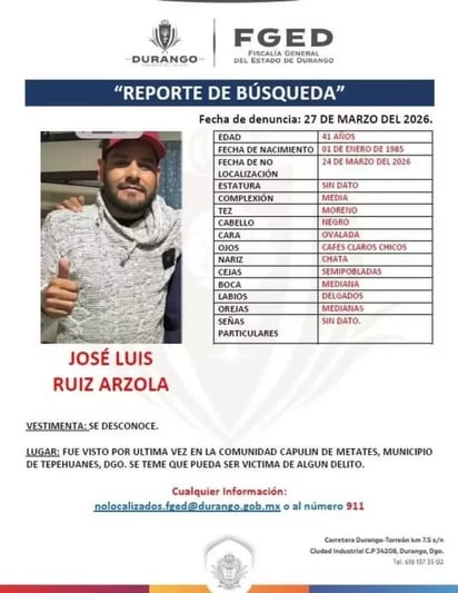 Sobre el hecho, familiares reportaron la desaparición de José Luis Ruiz Arzola, de 41 años de edad, el pasado 24 de marzo, momento en que fue visto por última vez en la comunidad de Capulín de Metates.