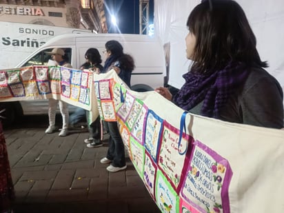Las integrantes del colectivo trabajaron durante un año para elaborar una manta, representando en cada cuadro el nombre de las mujeres víctimas de feminicidio en la entidad.