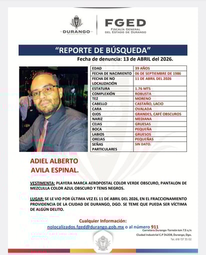 A través una ficha de búsqueda publicada por la Fiscalía General del Estado de Durango (FGED), se pidió la colaboración de la ciudadanía para tratar de localizar a un hombre duranguense que fue visto por última vez el pasado sábado 11 de abril en la capital duranguense.