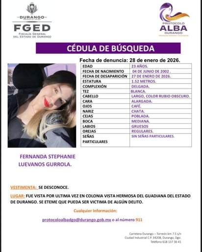 De acuerdo con la ficha de búsqueda, la joven Fernanda Stephanie Luevanos Gurrola, de 23 años de edad, con fecha de nacimiento del 4 de junio de 2002, fue vista por última vez en la colonia Vista Hermosa del Guadiana, en Durango.