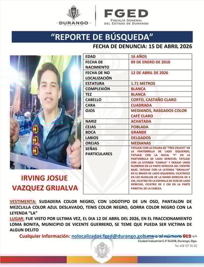 Irving Josué Vázquez Grijalva, de 16 años de edad, con fecha de nacimiento del 9 de enero de 2010, fue visto por última vez el pasado domingo 12 de abril en el fraccionamiento Loma Bonita del municipio de Vicente Guerrero.