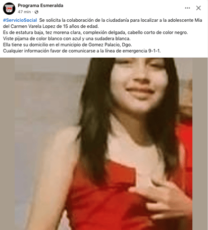 De acuerdo con una publicación realizada en redes sociales, se pidió la ayuda de los duranguenses para tratar de encontrar a la menor Mía del Carmen Varela López, de 15 años de edad.