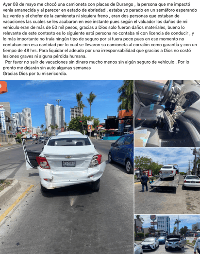 “Por favor no salir de vacaciones sin dinero mucho menos sin algún seguro de vehículo . Por lo pronto me dejarán sin auto algunas semanas”, señala el afectado en la publicación.