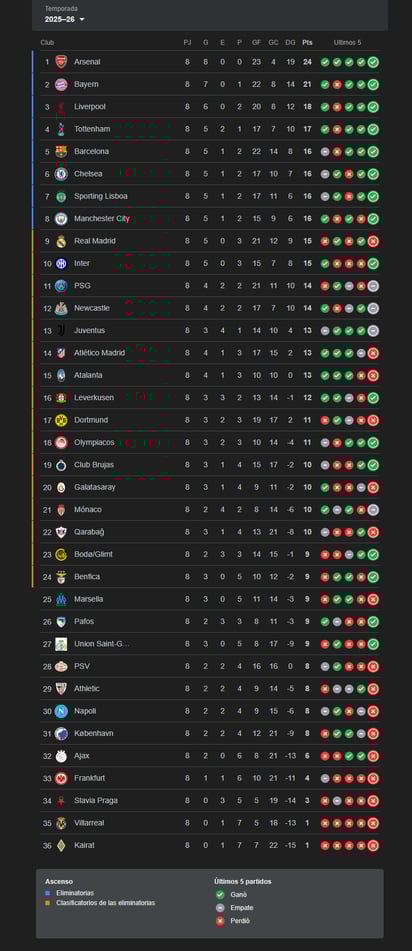 En lo más alto, el Arsenal de Mikel Arteta firmó una fase histórica; llegó a 24 puntos tras vencer 3-2 al Kairat Almaty y encabezó el grupo de clasificados directos, librándose del desgaste de febrero. Detrás aparecen Bayern Múnich (21), Liverpool (18), Tottenham (17), FC Barcelona (16), Chelsea (16), Sporting de Lisboa (16) y un Manchester City (16) que arrebató su lugar en el último suspiro tras superar al Galatasaray en casa.