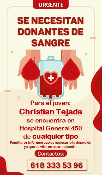 En caso de poder ayudarlo, él se encuentra internado en el Hospital Geneneral 450, puede ser cualquier tipo de sangre. Si necesitas más información, puedes comunicarte al 618 333 53 96.