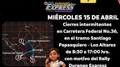 A través de la Coordinación Estatal de Protección Civil (CEPC) se dio a conocer que estos cierres se deben al Rally Durango Express, que es una competencia de automovilismo por lo que, para evitar accidentes, se exhortó a atender las indicaciones de las autoridades que se encuentran en la zona.
