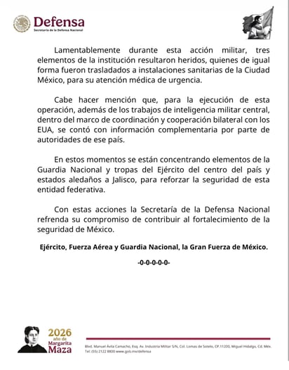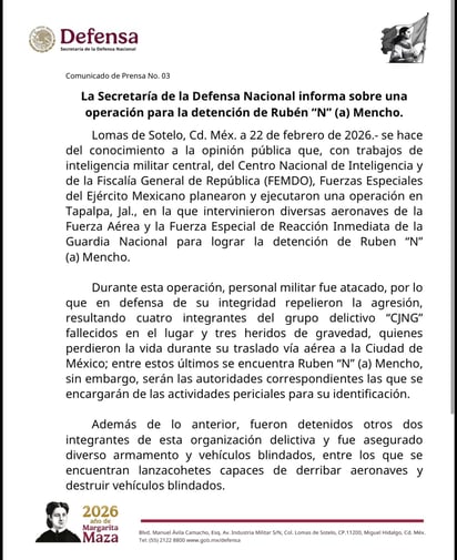 A través de un comunicado emitido por la Defensa, se dio a conocer que “con trabajos de inteligencia militar central, del Centro Nacional de Inteligencia y de la Fiscalía General de República (FEMDO), Fuerzas Especiales del Ejército Mexicano planearon y ejecutaron una operación en Tapalpa, Jal., en la que intervinieron diversas aeronaves de la Fuerza Aérea y la Fuerza Especial de Reacción Imediata de la Guardia Nacional para lograr la detención de Ruben ’N’ (a) Mencho".
