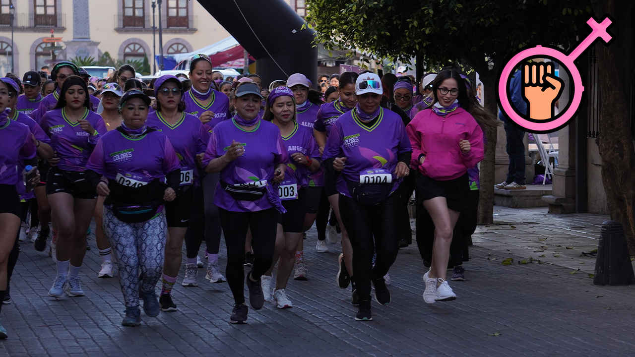 La concentración inició con grupos que llegaban por su cuenta o en familia, muchas portando playeras moradas o pañuelos alusivos a la fecha. La salida se dio de manera ordenada y con un flujo constante de participantes que avanzaron a distintos ritmos, desde trote ligero hasta caminata acompañada.