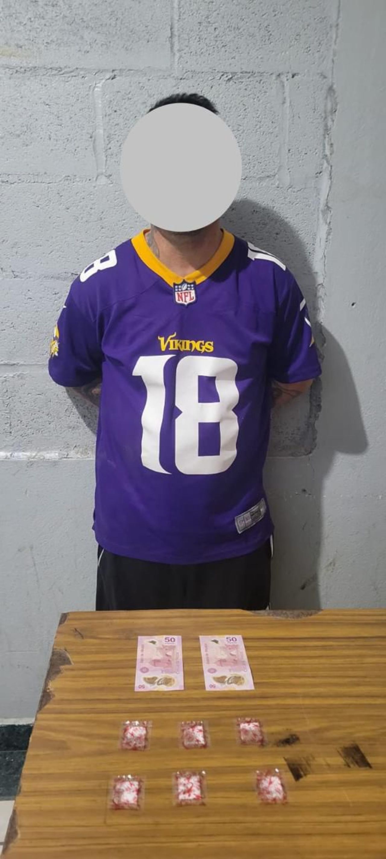 Los sujetos fueron identificados únicamente como Ernesto, de 27 años de edad, con domicilio en el ejido Martha del municipio de Mapimí, a quien se le encontraron seis bolsas de celofán con polvo blanco semigranulado con las características del "cristal" y 100 pesos en efectivo.