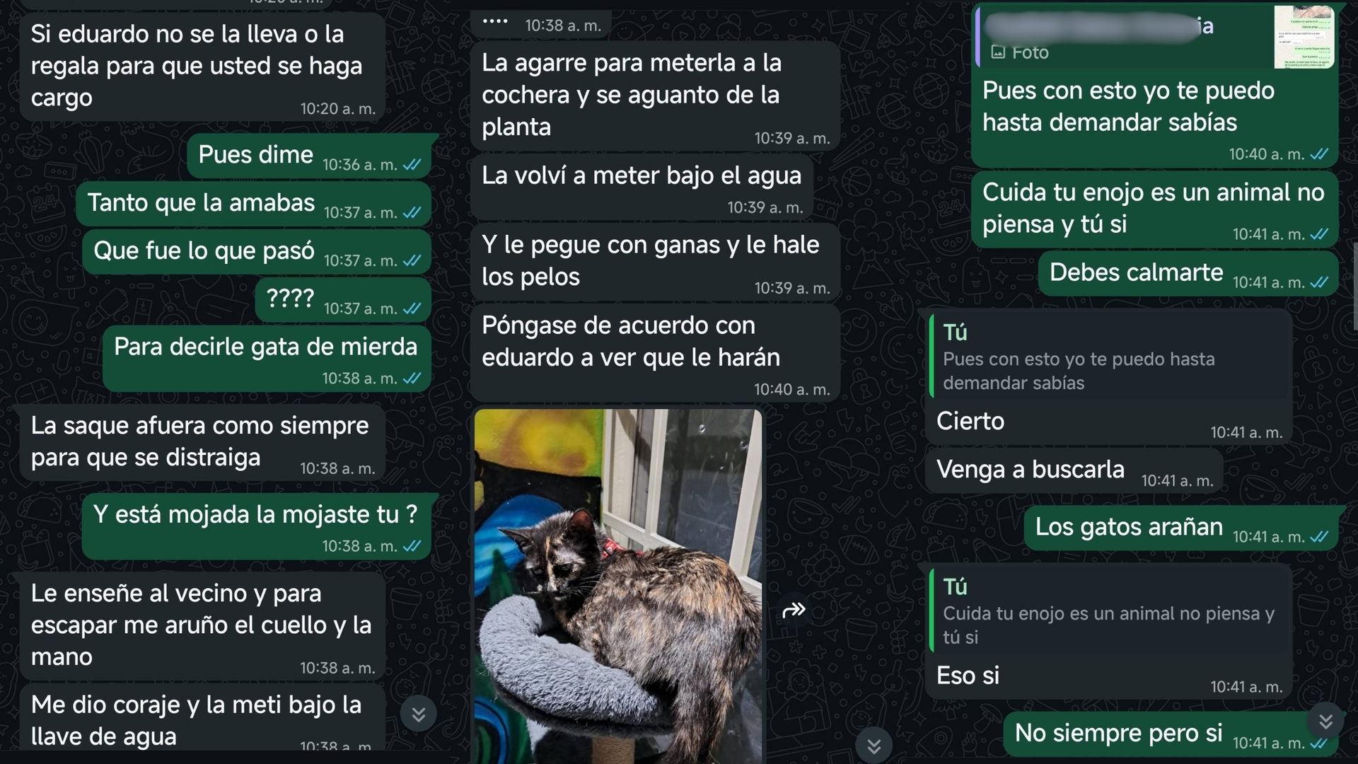 En su publicación, Liliana describió el momento en que recibió el material. “En días pasados recibí unas fotos y mensajes en los que se aprecia a la gatita mojada y groserías e insultos hacia ella, de igual manera comentó que golpeó a la gatita e incluso la puso bajo la llave del agua”.