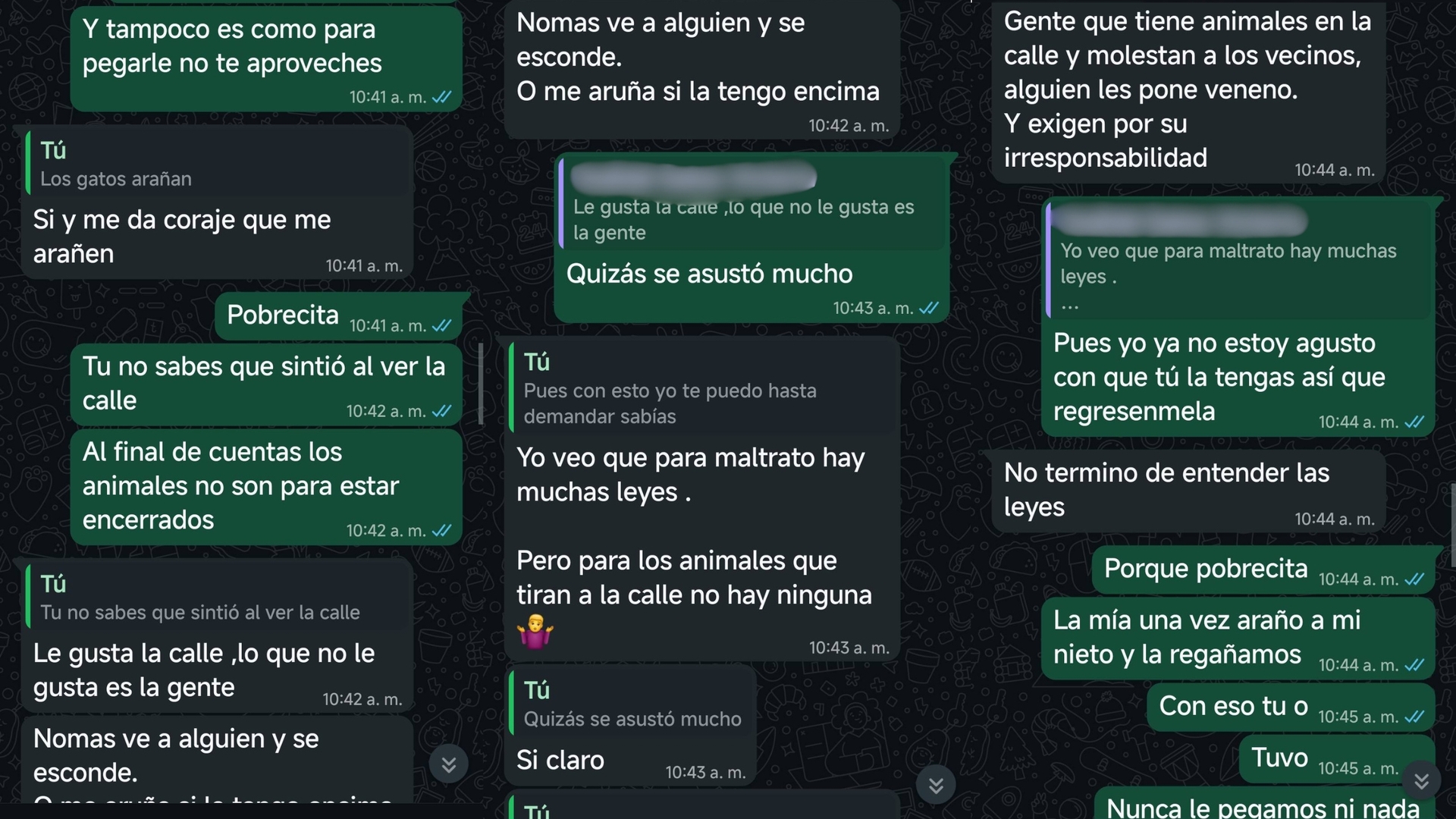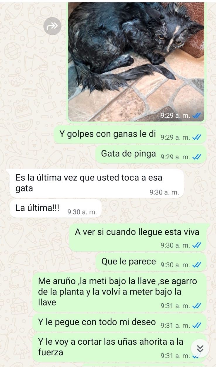 Junto al texto, la usuaria publicó una serie de capturas de la conversación, donde explica que agredió a la felina por “unos arañazos”, tratando de justificar lo que había sucedido.