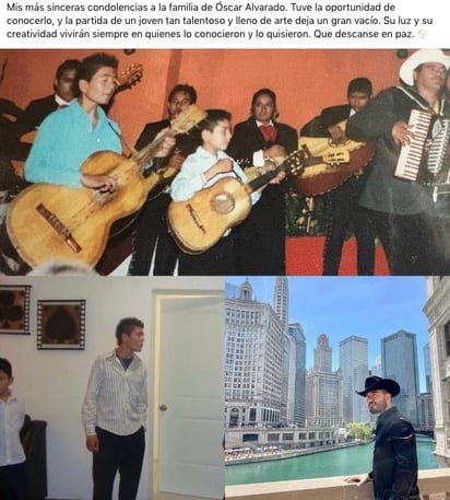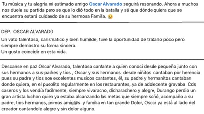 “Talentoso cantante a quien conocí desde pequeño junto con sus hermanos, a sus padres y tíos. Óscar y sus hermanos desde niñitos cantaban por herencia, pues su padre y tíos son excelentes músicos cantantes. Él, su padre y hermanitos cantaban donde quiera en El Pueblito, regularmente en los restaurantes”, recordaron en redes sociales, asegurando que “Durango perdió un gran artista, luchón, quien ya estaba alcanzando las metas que siempre soñó”.