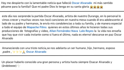 En más mensajes que fueron compartidos, con fotografías del cantante, lo recordaron con un hombre que transmitía su alegría y gusto por la música, y que dejará un vacío grande en el gremio musical de Durango y del regional mexicano.