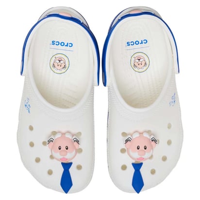 La edición especial retoma el clásico modelo de Crocs, en color blanco con detalles en azul que hacen referencia directamente a la imagen del Dr. Simi. Sin embargo, lo que distingue a este calzado son los elementos personalizados.