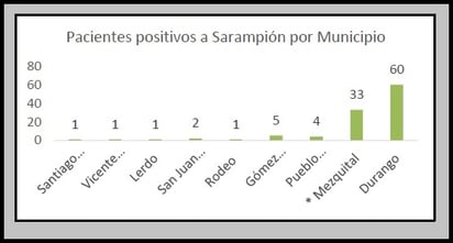 Por municipios, únicamente Durango registró un incremento, al pasar de 61 a 63 casos positivos. Mezquital se mantiene con 33; Pueblo Nuevo y Gómez Palacio con cuatro cada uno; San Juan del Río con dos; y con un solo caso permanecen Rodeo, Lerdo, Vicente Guerrero y Santiago Papasquiaro.