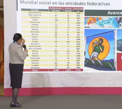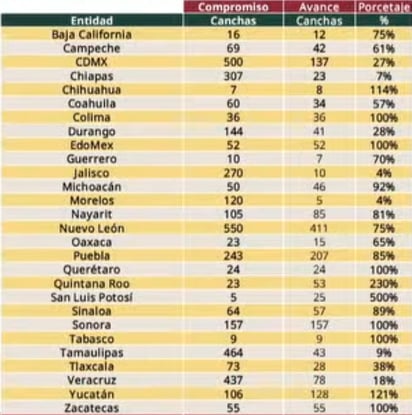 La funcionaria mostró hoy, en “La Mañanera”, una tabla en la que se muestra el avance en la reconstrucción de canchas deportivas, en la que Durango aparece con un compromiso de 144 canchas, un avance de apenas 41, es decir un 28 por ciento, siendo de los más bajos a nivel nacional.