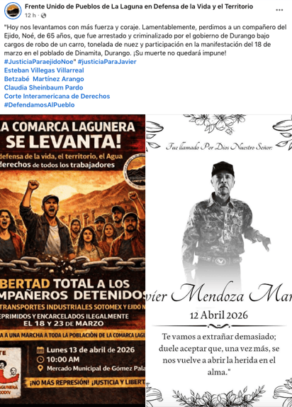 "Hoy nos levantamos con más fuerza y coraje. Lamentablemente, perdimos a un compañero del Ejido Noé, de 65 años, que fue arrestado y criminalizado por el gobierno de Durango bajo cargos de robo de un carro, tonelada de nuez y participación en la manifestación del 18 de marzo en el poblado de Dinamita, Durango. ¡Su muerte no quedará impune!”, se lee en una de las publicaciones acompañada de la esquela de Javier Mendoza y una convocatoria a una protesta.