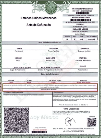 Este documento no solo confirmó que el líder criminal murió durante el operativo realizado el pasado 22 de febrero en inmediaciones del complejo Tapalpa Country Club, sino también la causa exacta.