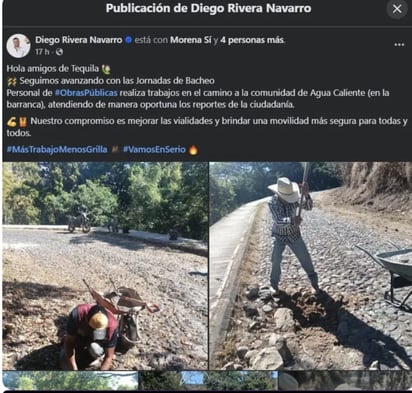 "Hola, amigos de Tequila. Seguimos avanzando con las Jornadas de Bacheo. Personal de #ObrasPúblicas realiza trabajos en el camino a la comunidad de Agua Caliente (en la barranca), atendiendo de manera oportuna los reportes de la ciudadanía Nuestro compromiso es mejorar las vialidades y brindar una movilidad más segura para tod@s".