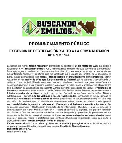 Desde la asociación Buscando Emilios, integrada por madres buscadoras y familiares de personas desaparecidas, se realizó un pronunciamiento público en el que se pide a la sociedad en general y a los medios de comunicación no criminalizar a las personas desaparecidas, principalmente cuando se trata de menores de edad.