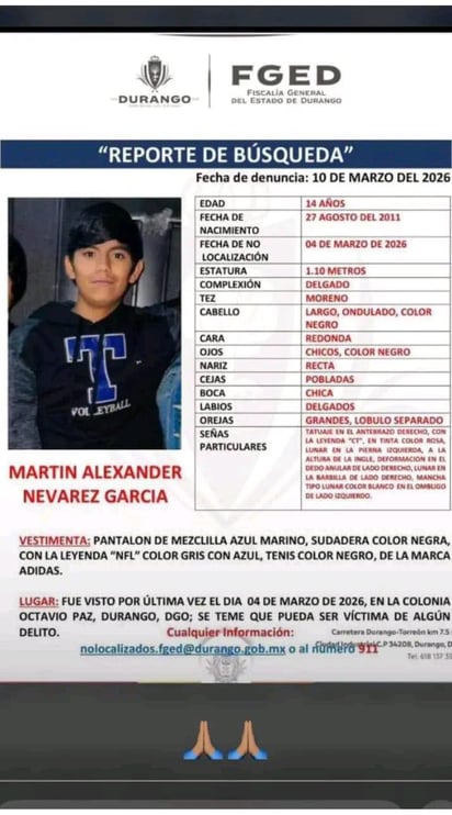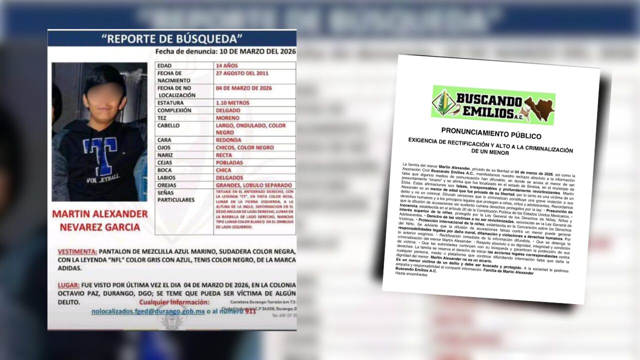 La familia de Martín Alexander, uno de los dos menores desaparecidos desde el pasado 4 de marzo, quien fue visto por última vez en la colonia Octavio Paz de la ciudad de Durango, rechazó la versión de que fue localizado y detenido en Sinaloa durante un operativo.