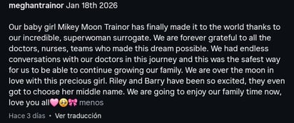 La nueva situación se originó en Instagram, luego de que Trainor diera a conocer la noticia del nacimiento de su hija por gestación subrogada.